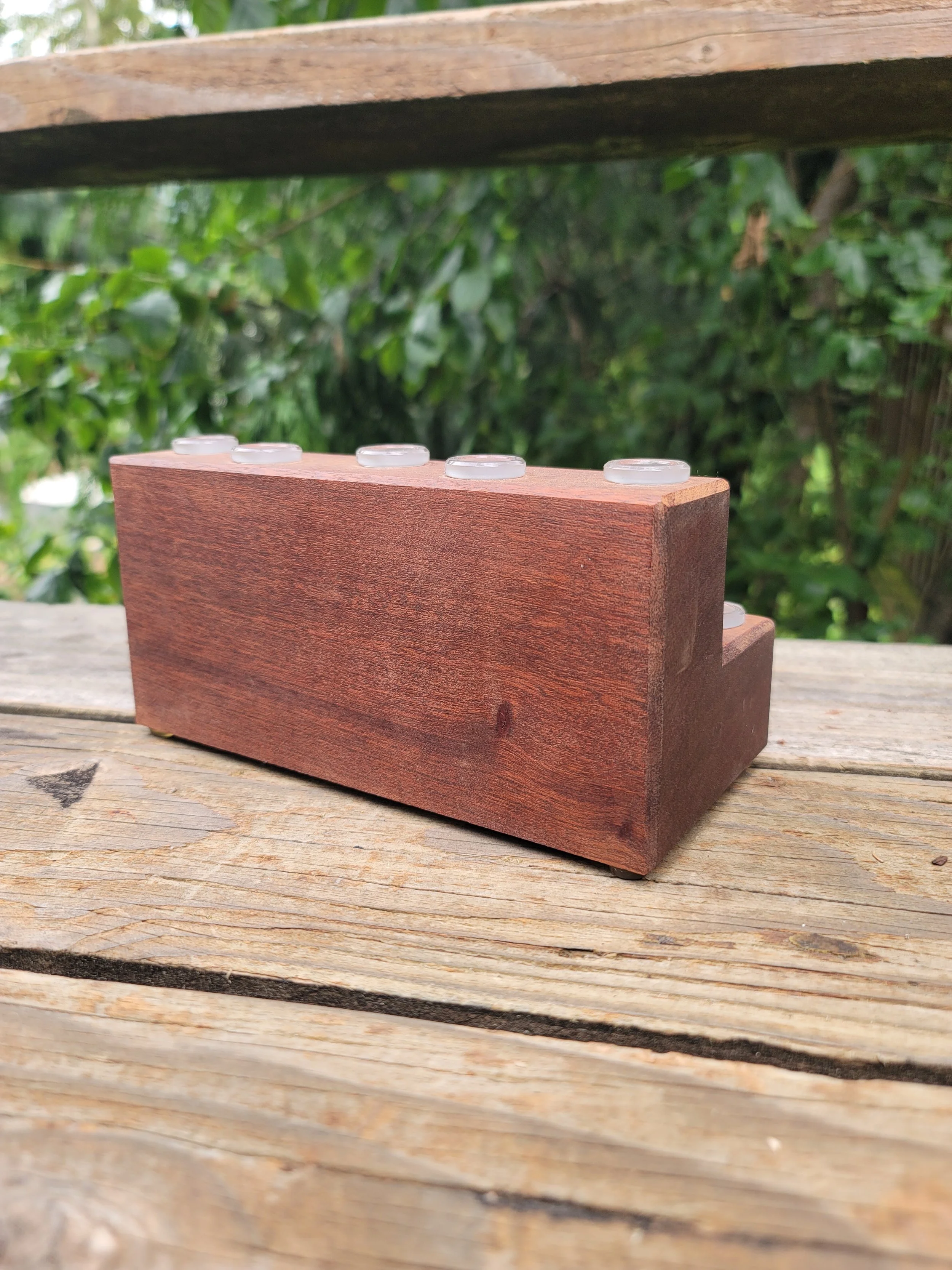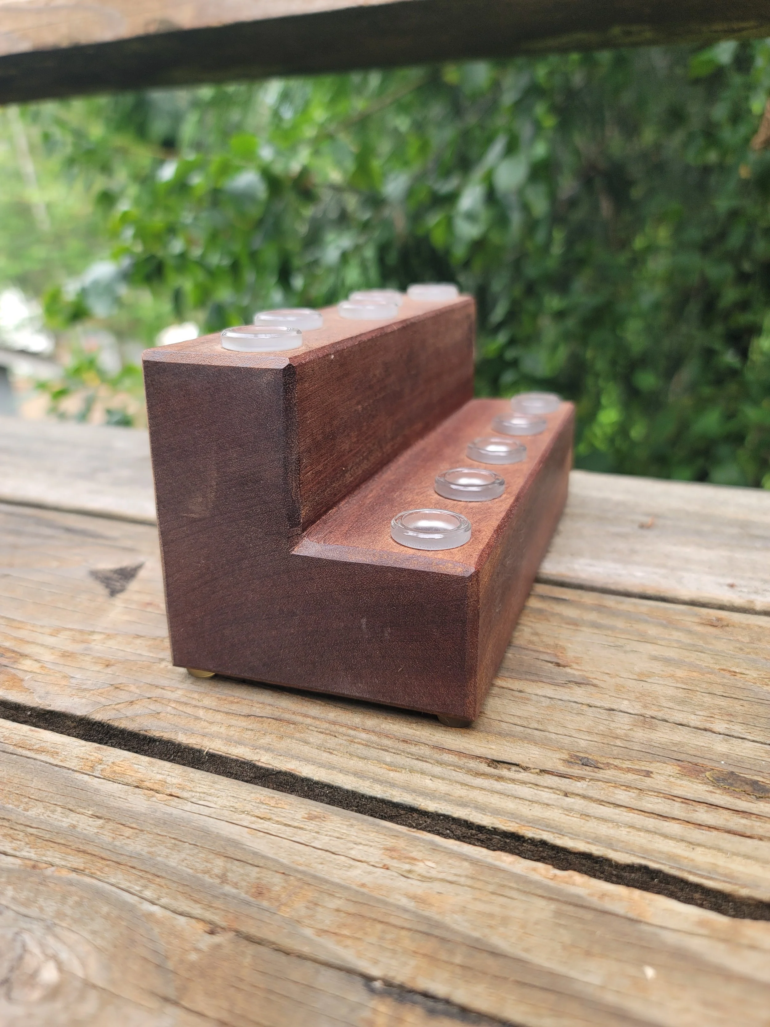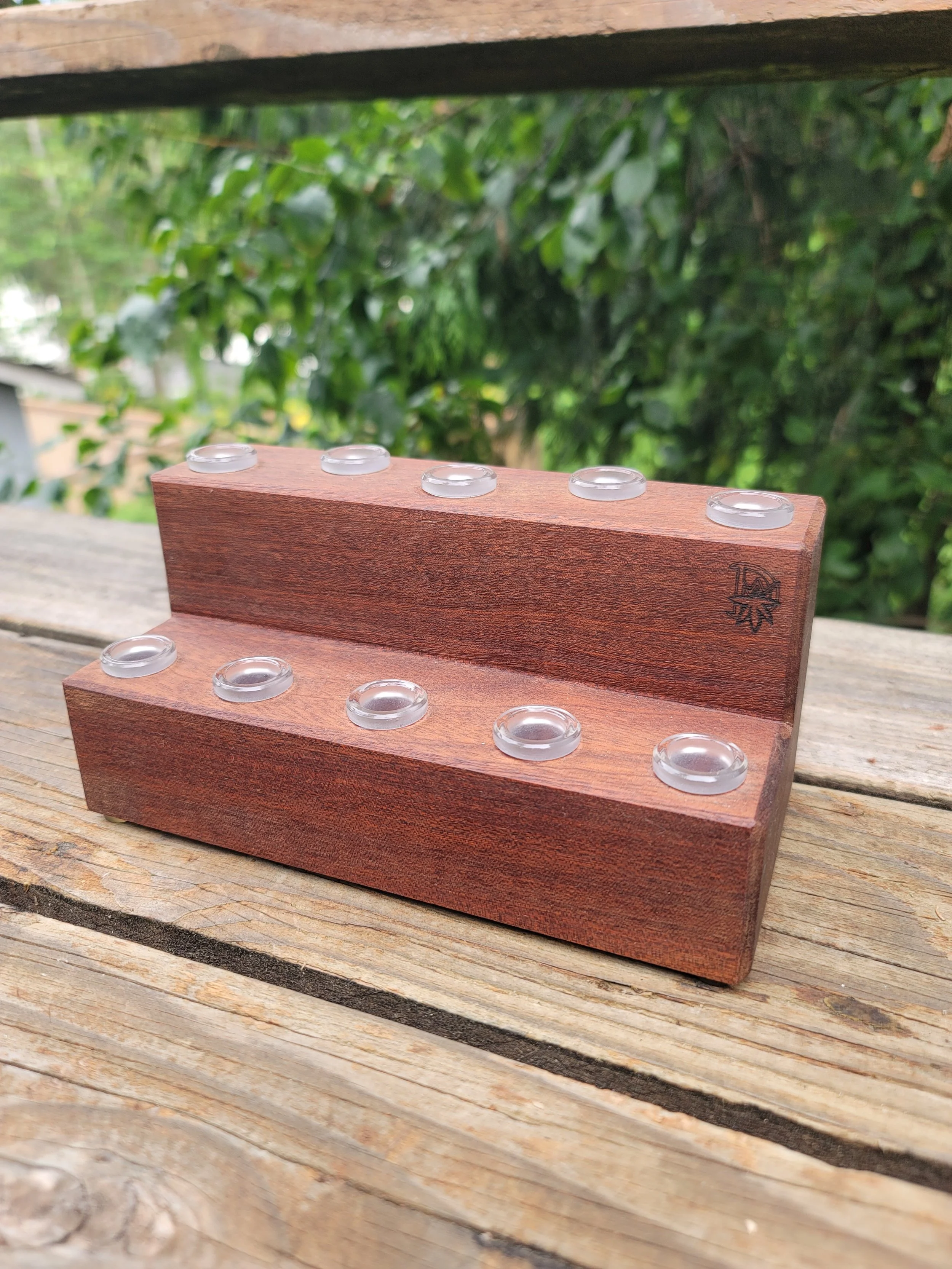 Constructed from a single piece of Sapele this two-tiered stand boasts ten 14mm clear glass joints, five per level. Completed with a natural oil finish and black rubber feet